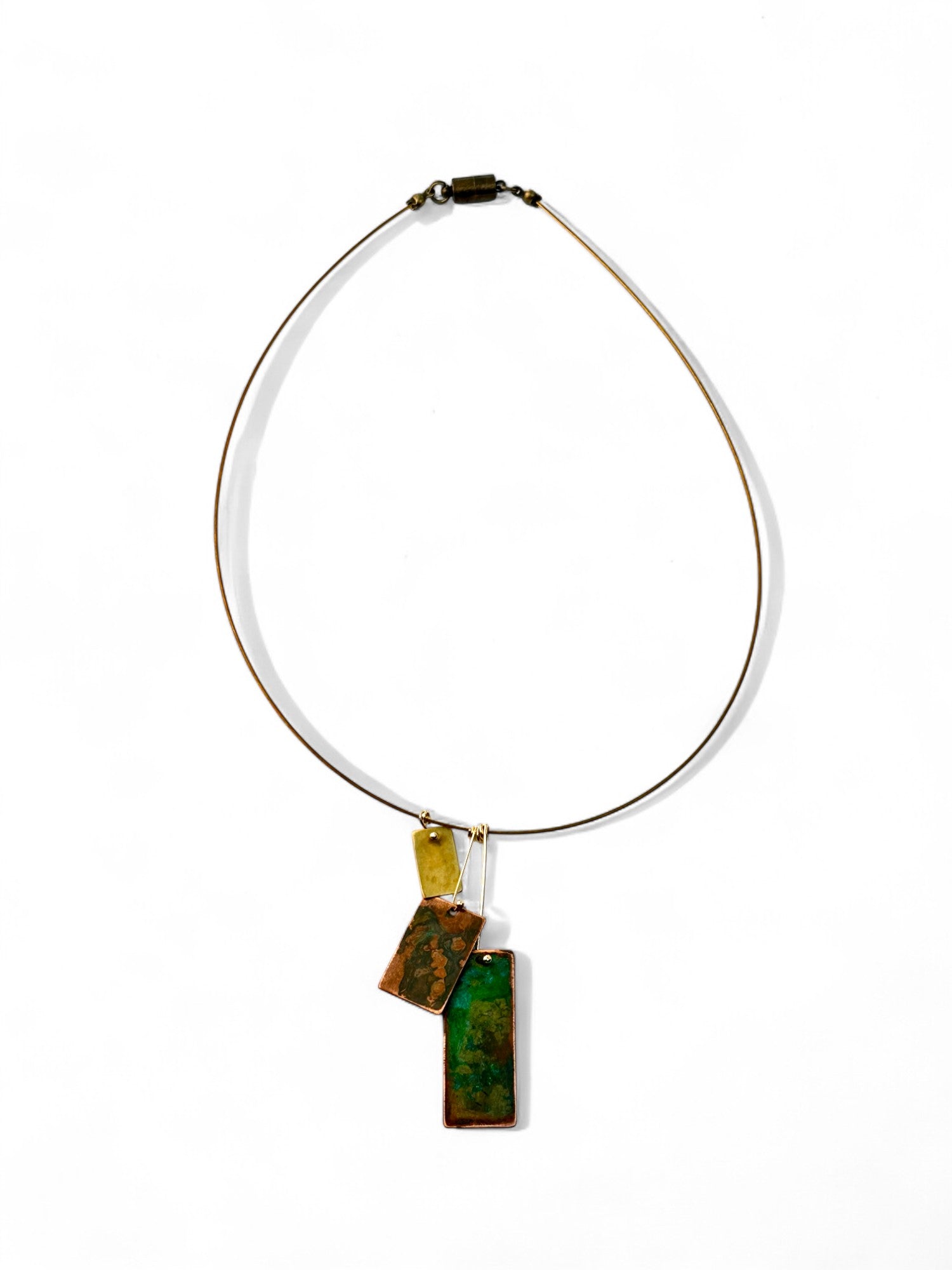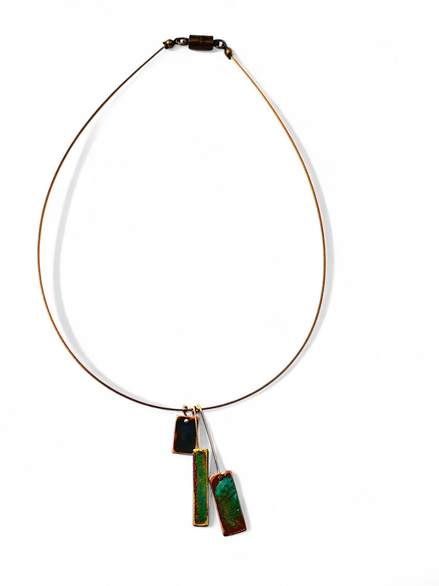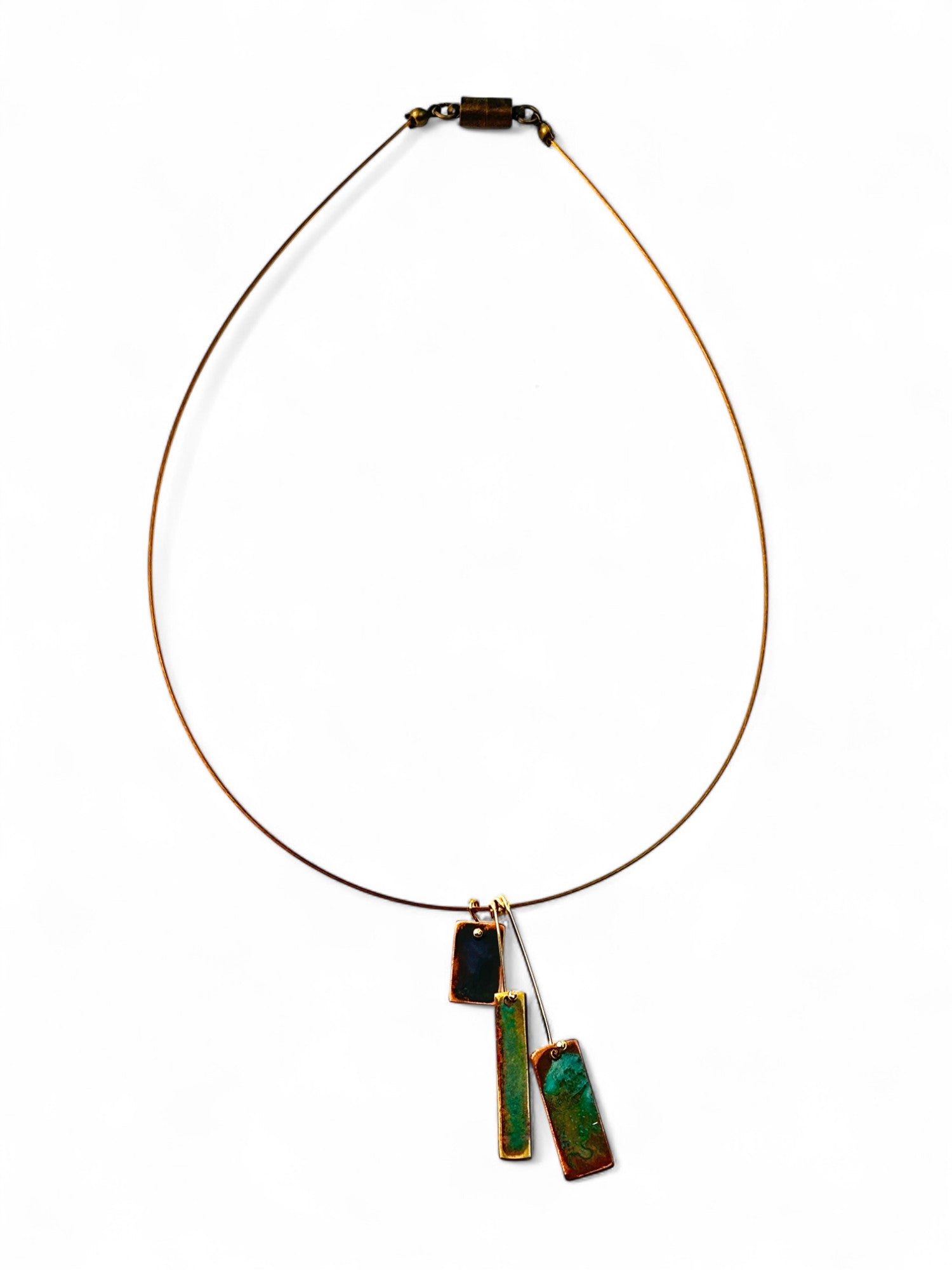 Gargantilha Tribu. Cada peça é única com combinações de cores variadas. Cortado manualmente, martelado e oxidado, cabo de aço e fecho magnético