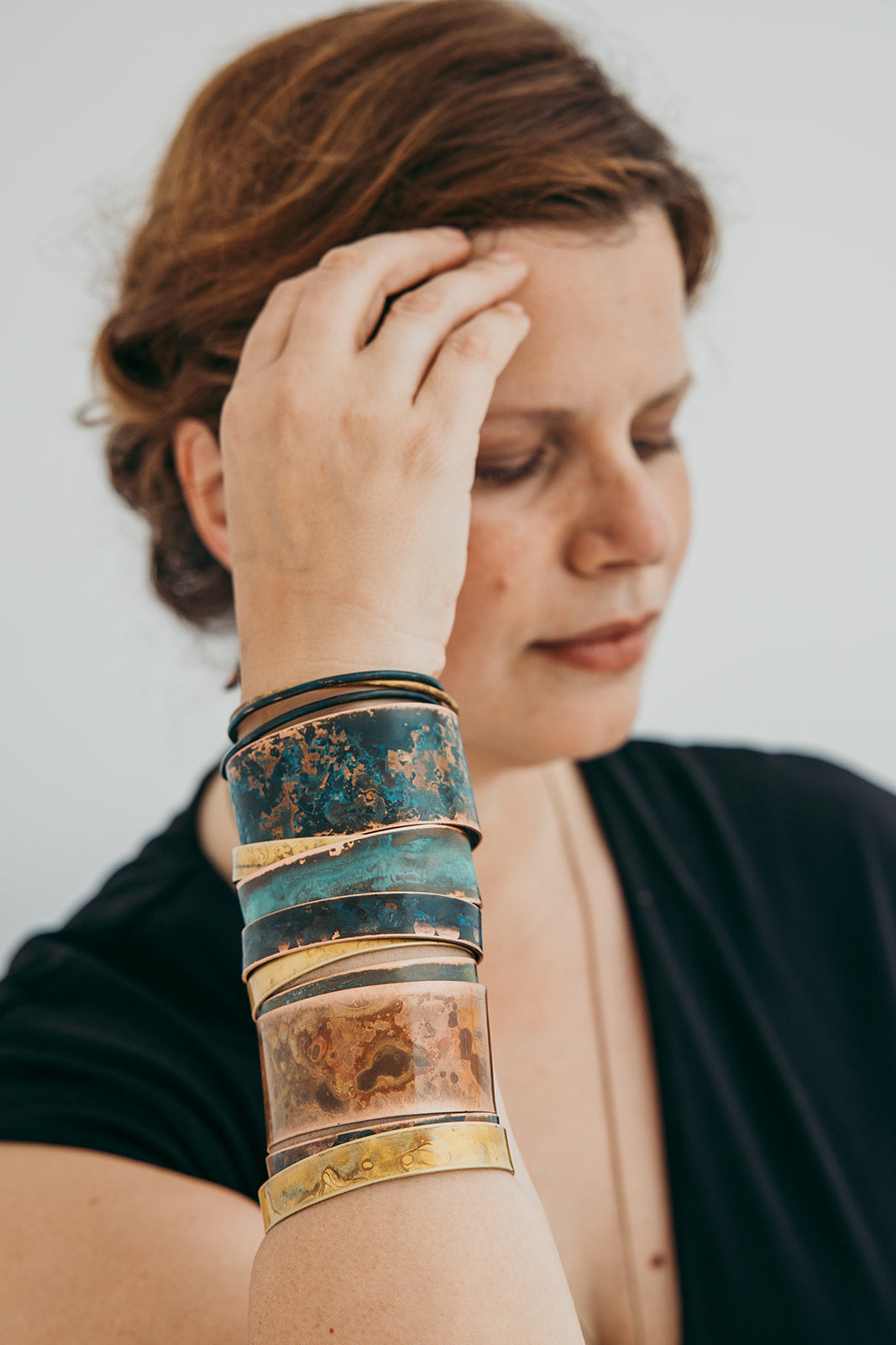 A imagem principal do produto mostra a peça disponível para compra, mas procuramos sempre incluir uma fotografia de contexto, com a peça usada por uma modelo ou em cenário. Essa foto pode não corresponder exatamente à peça que que receberá, podendo ser de outro metal ou de uma tonalidade diferente de oxidação; serve apenas como exemplo de como a peça fica no uso.